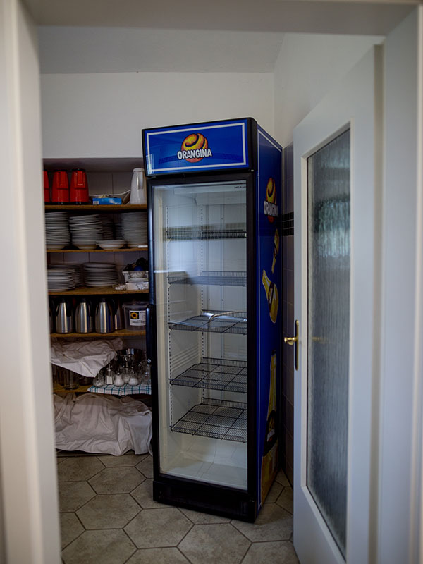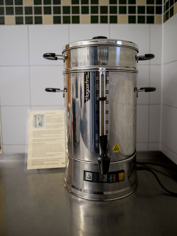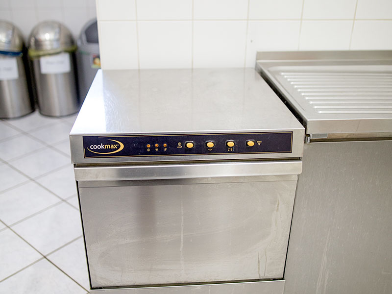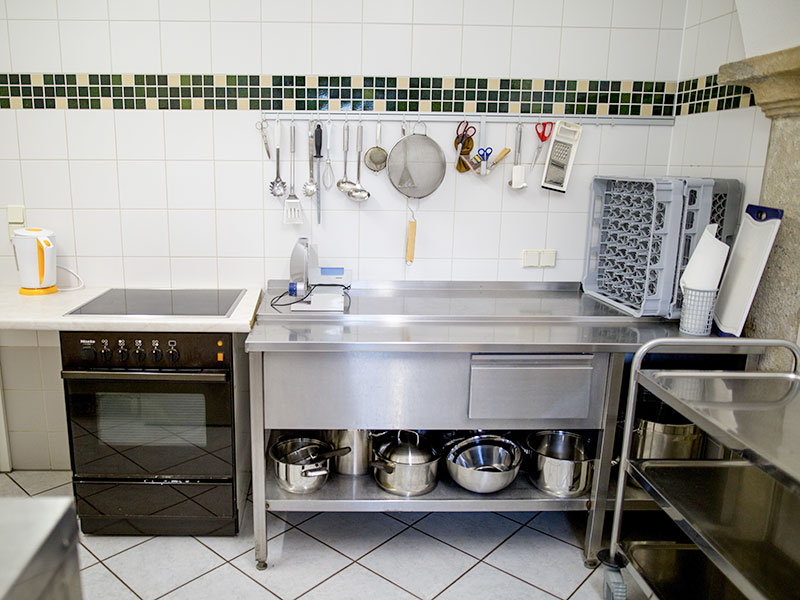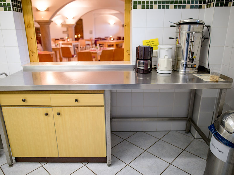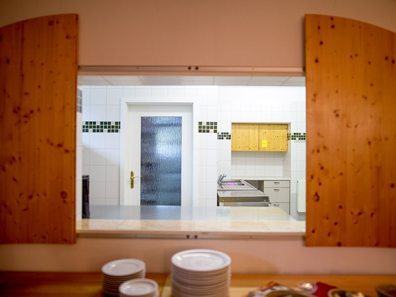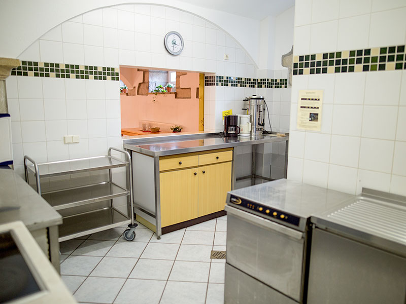Unsere Küche ist mit einem schnellen Geschirrspüler, einer großen Kaffemaschine (120 Tassen), Kühlschrank, Elektroherd und Edelstahlarbeitsflächen ausgestattet. Die Küche ist mit einer Durchreiche mit dem Saal verbunden. So können Kaffeenachschub und Snacks schnell transportiert werden.
