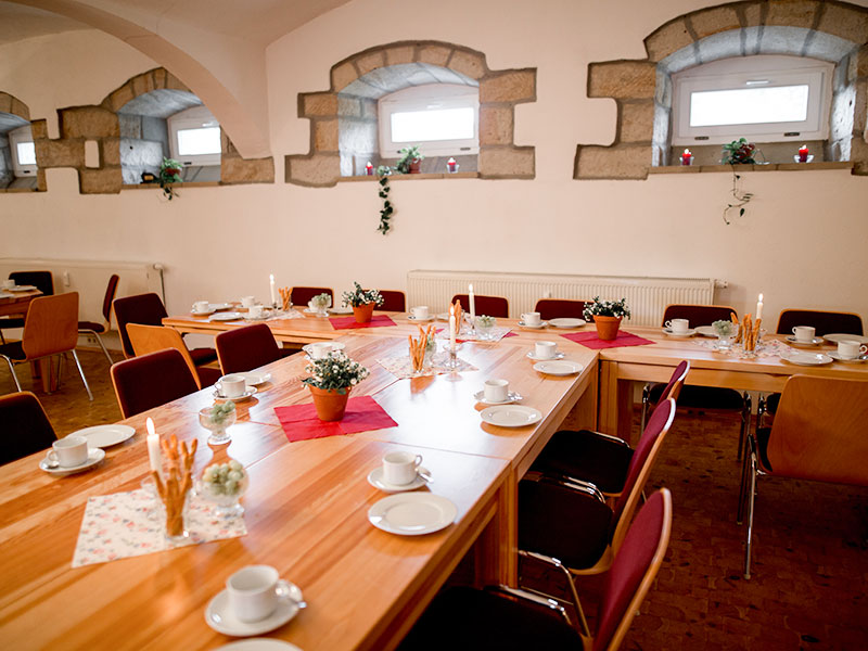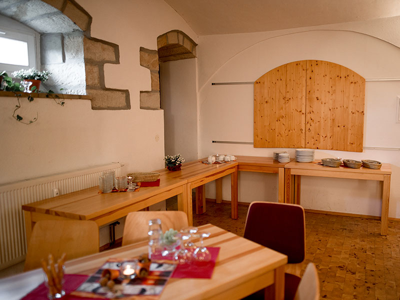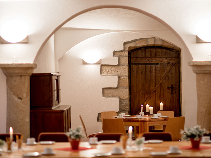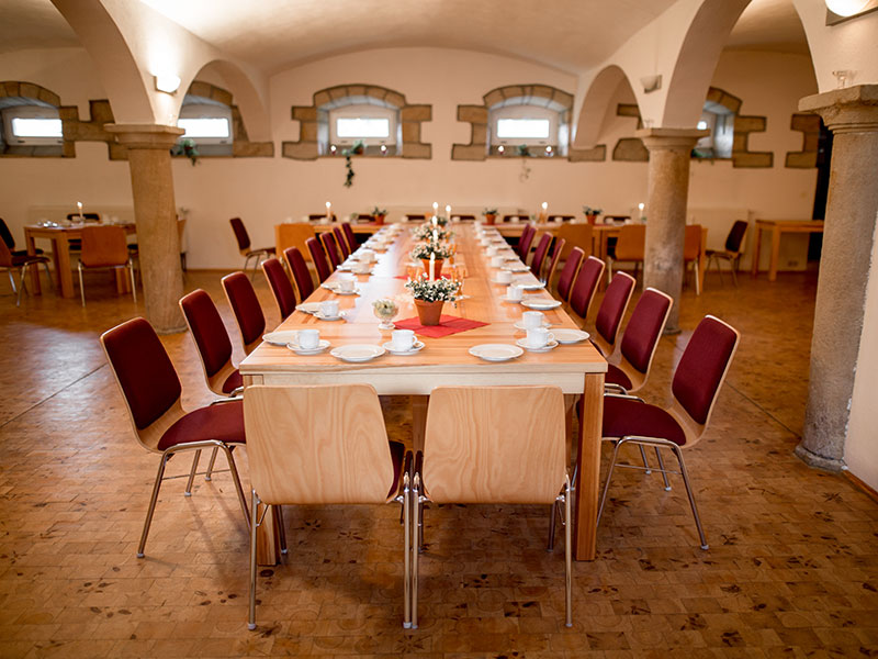 Aus dem ehemaligen Kuhstall mit Tonnengewölbe entstand ein großer Saal mit angeschlossener Küche und Sanitäranlagen. Außerdem gibt es im Erdgeschoss einen kleineren Seminarraum und einen Hofladen.